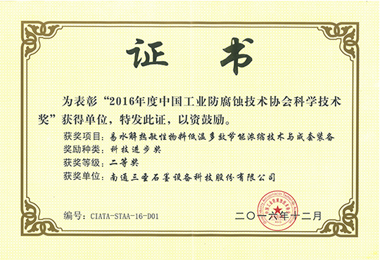 三圣石墨的“易水解熱敏性物料低溫多效節(jié)能濃縮技術與裝備”獲得中國工業(yè)防腐蝕技術協(xié)會頒發(fā)的科技進步二等獎。此次評獎一等獎空缺,我公司獲得的獎項為石墨設備行業(yè)唯一的一個二等獎。
