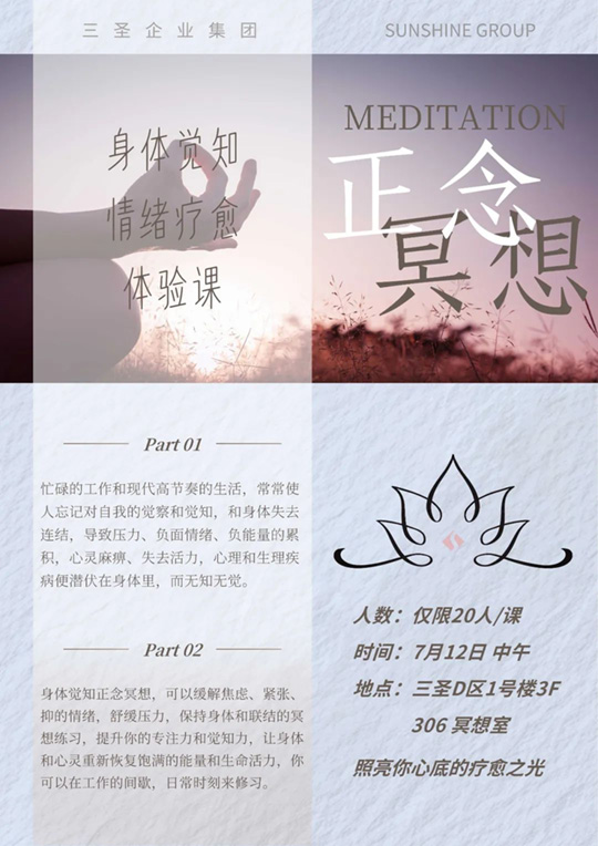 三圣集團最新開設的冥想課程,旨在幫助職工通過冥想達到內心的寧靜與平和,提升個人的情緒管理、專注力和生活質量。隨著今天第一堂體驗課的啟動,之后每周都有免費的公益課程可報名參加。這一全新形式的開放課程,升華了三圣企業(yè)文化的精神內涵。